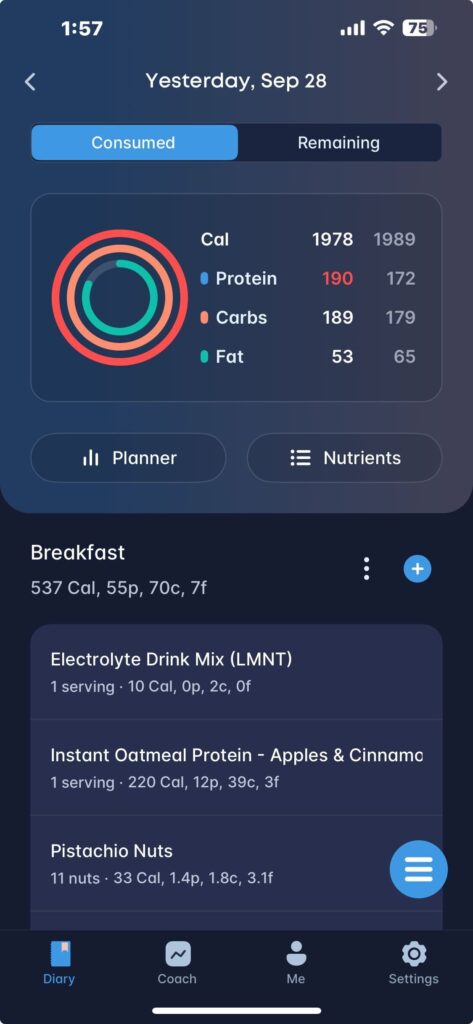 Here are a couple of suggestions. I use a food tracking app called Carbon. It’s a great way to set goals and ensure you get enough protein while not overeating, according to your ideal calorie intake. It takes a few minutes a day and is user-friendly.