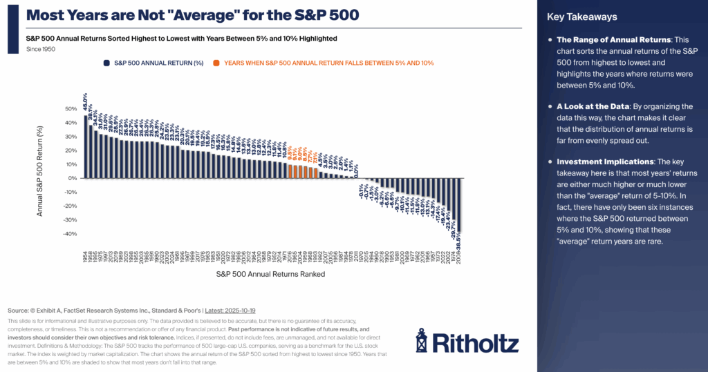 Including the fact that the U.S. market’s $50 trillion valuation makes this 1% dip seem like a bad hair day rather than a financial apocalypse. Newsflash – Markets are volatile and rarely post “average” returns..