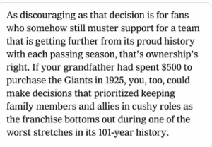 Family involvement has been a constant throughout one of the worst decades in Giant history. One would think a degree of self-awareness would emerge from the darkness. Self-reflection would prompt them to take a step back and hire competent professionals to manage the operation while they step aside.