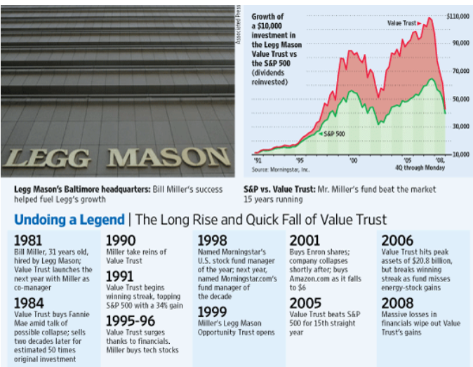 Fund Manager Bill Miller’s Legg Mason Value Trust outperformed the S&P 500 for 15 years (1991-2005), earning him the title of investment legend. The tides turned when Miller drifted from his disciplined value style and severe underperformance in the late 2000s erased much of the prior excess return and his sterling reputation.